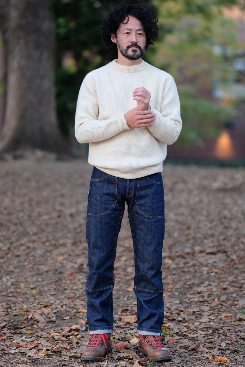 上記したデザインコンセプトを実現するには、やはり生地選びも慎重にならざるを得ません。私の考えるクライミングパンツとして最適なデニムに出会うまでには少々時間が掛かりました。今回のファブリック選びのポイントとしては、