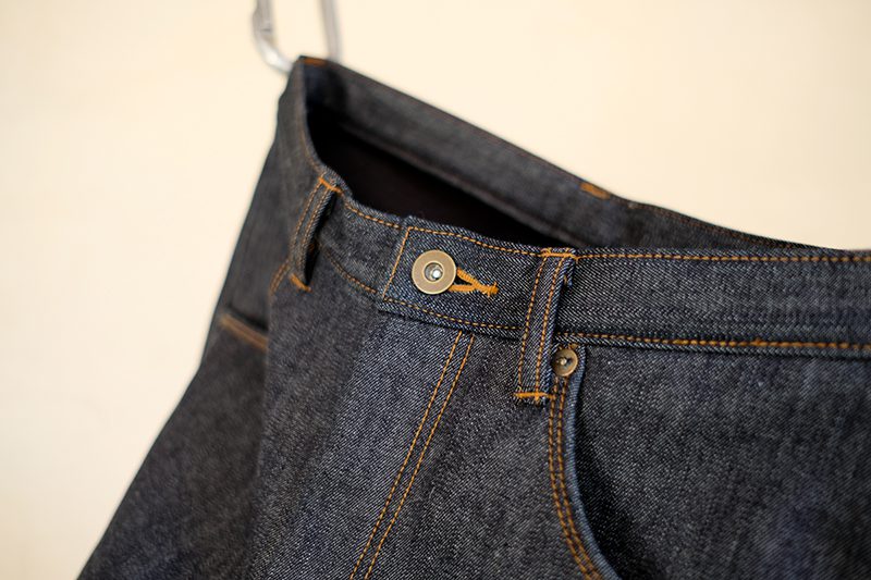 やや丸みのある金属製のボタン。フロントポケット口には補強の為の抜き打ちリベット。バックポケット、ベルトループはカン抜い仕様。