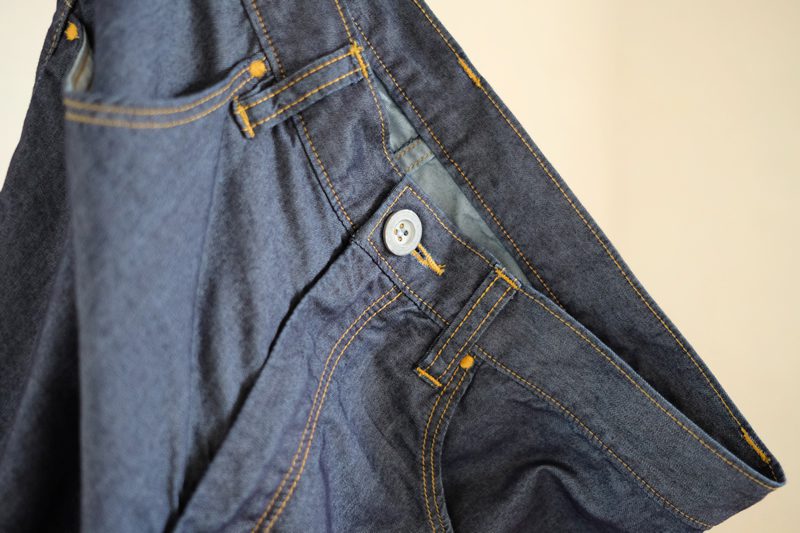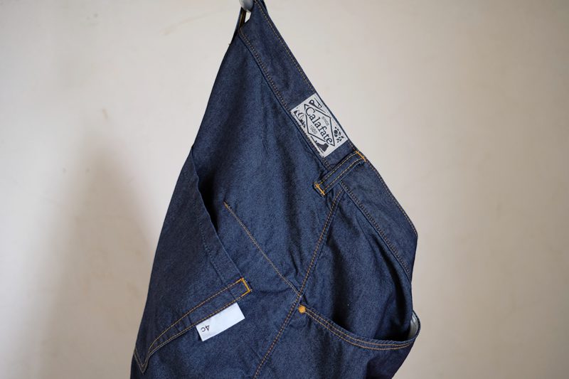 Calafateオリジナルパッチ、ワンウォッシュ仕上げ、ポケット袋布にはコットンポリエステルのブロード生地、超軽量の金属製ボタン、フロントポケットには補強の為の丸閂止め、バックポケット、ベルトループは閂止めの仕様。