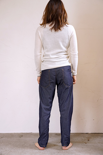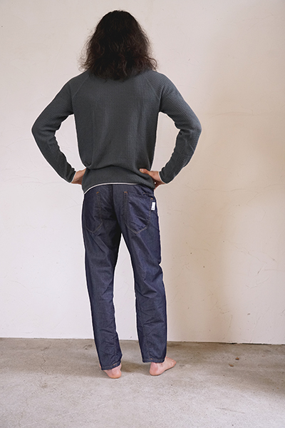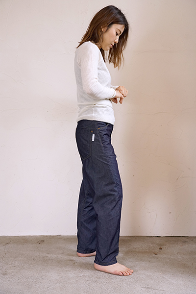 ワンウォッシュ仕上げ、ポケット袋布にはコットンポリエステルのブロード生地、超軽量の金属製ボタン、フロントポケットには補強の為の丸閂止め、バックポケット、ベルトループは閂止めの仕様。